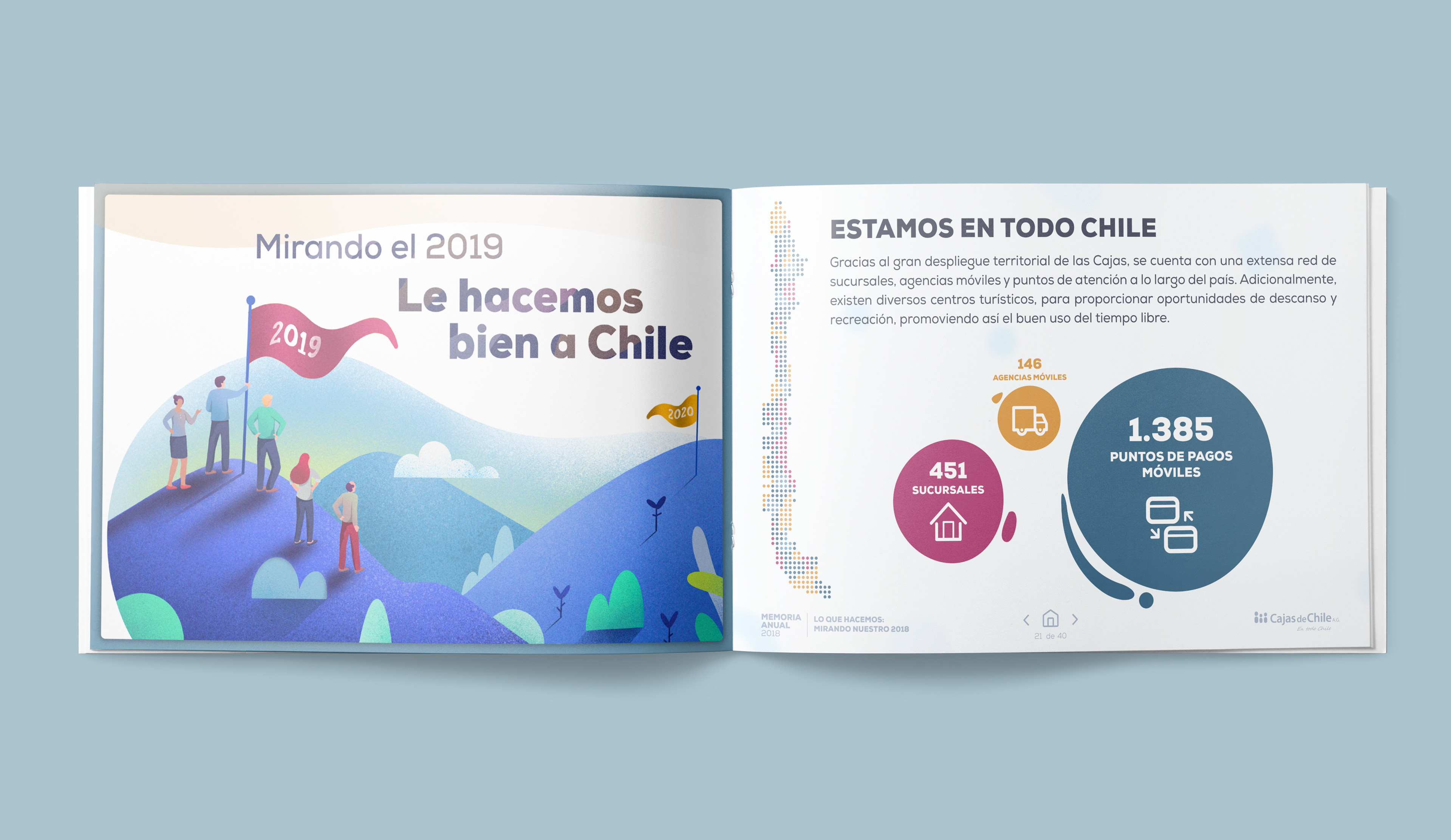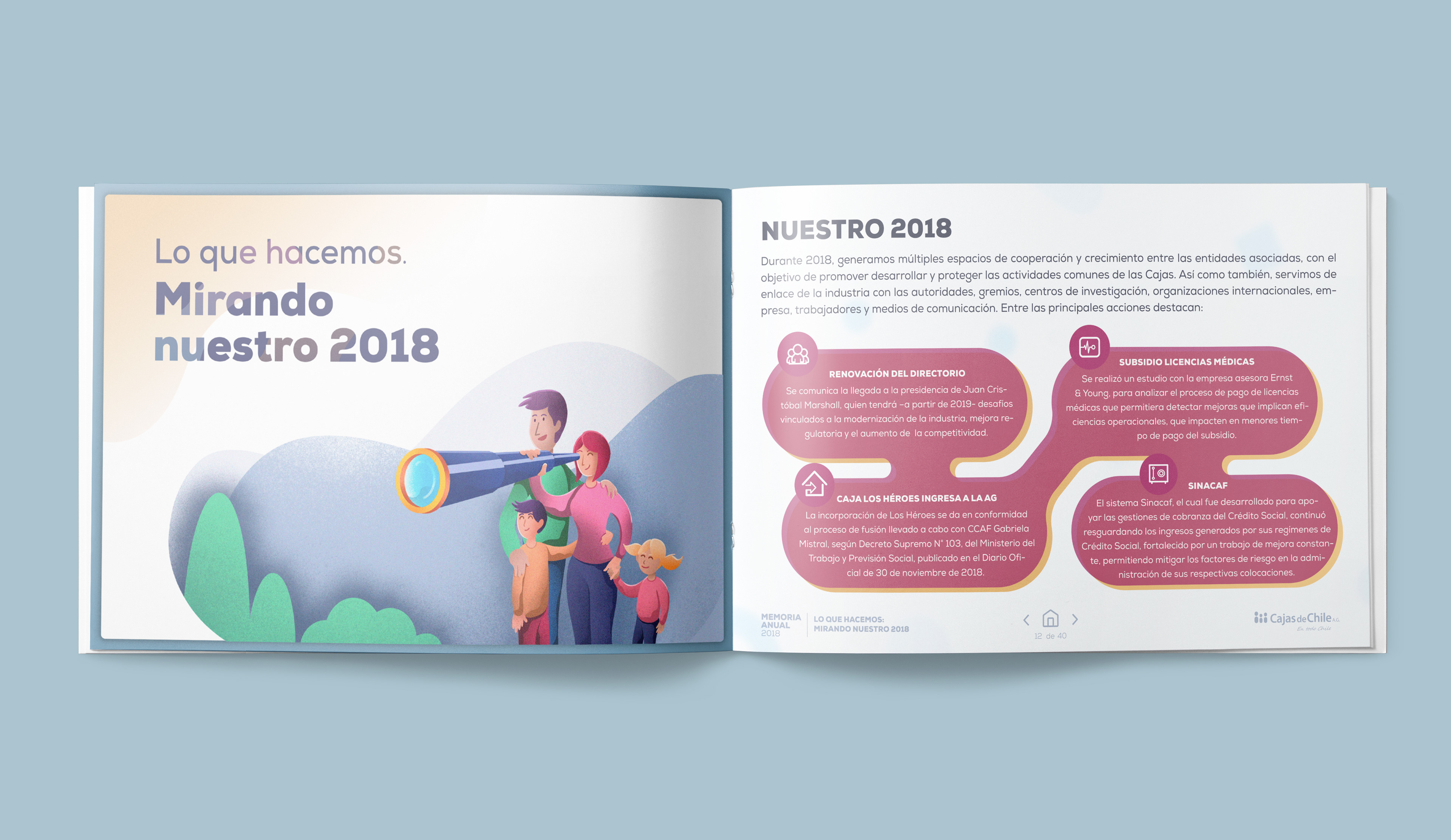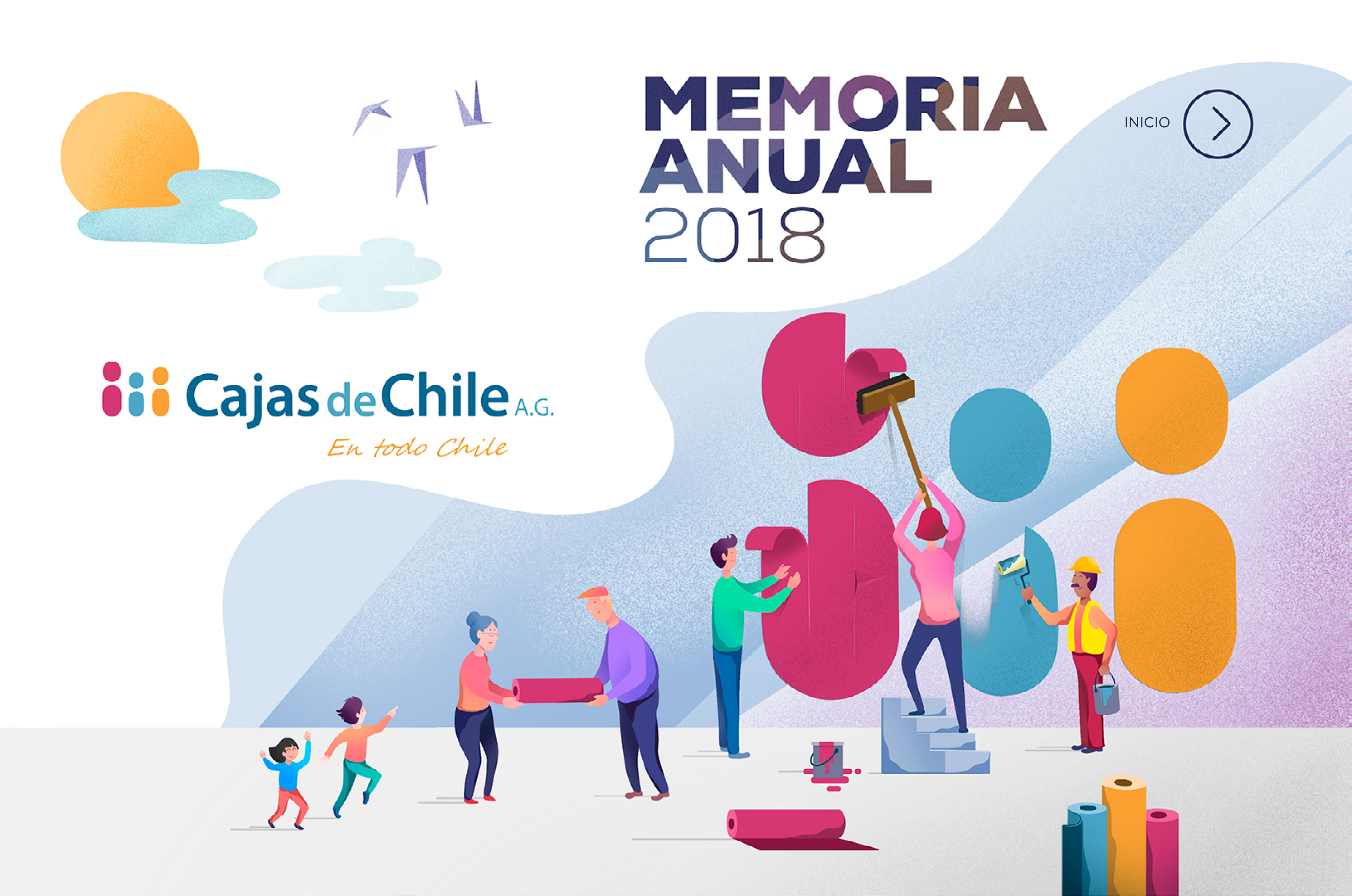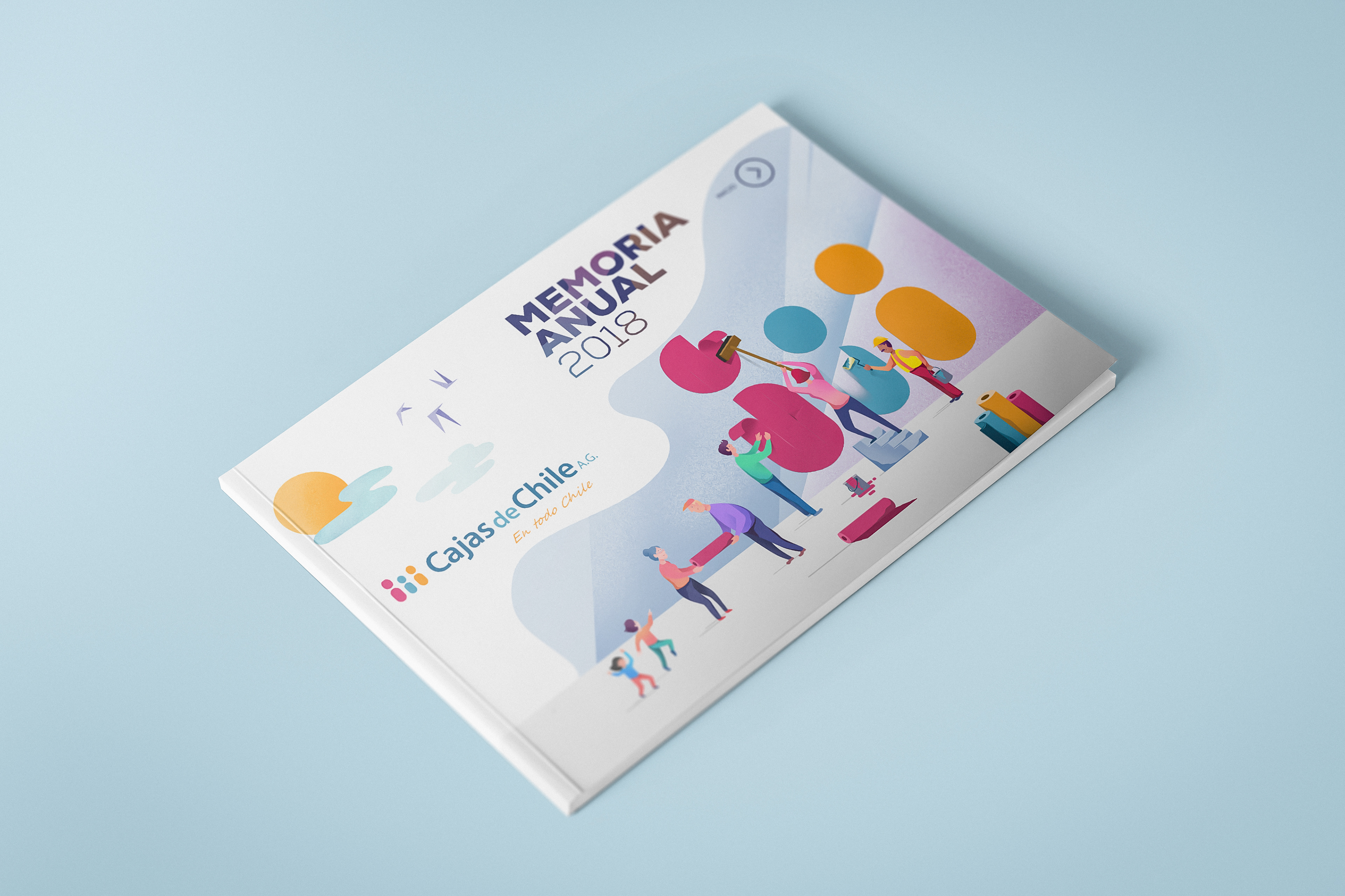 Dirección de Arte de Memoria Anual de Cajas de Chile 2018. Diseño, diagramación e ilustración.