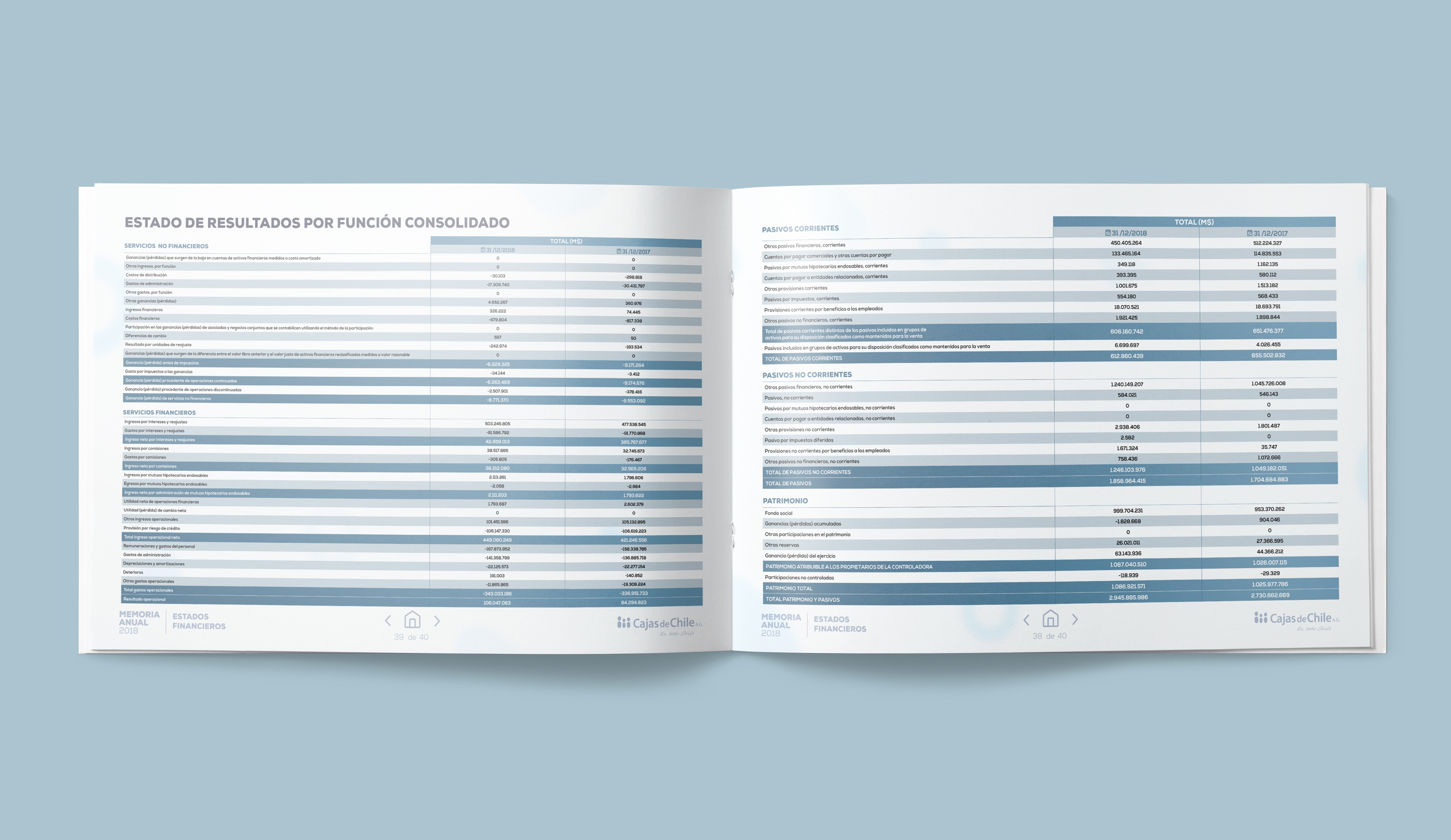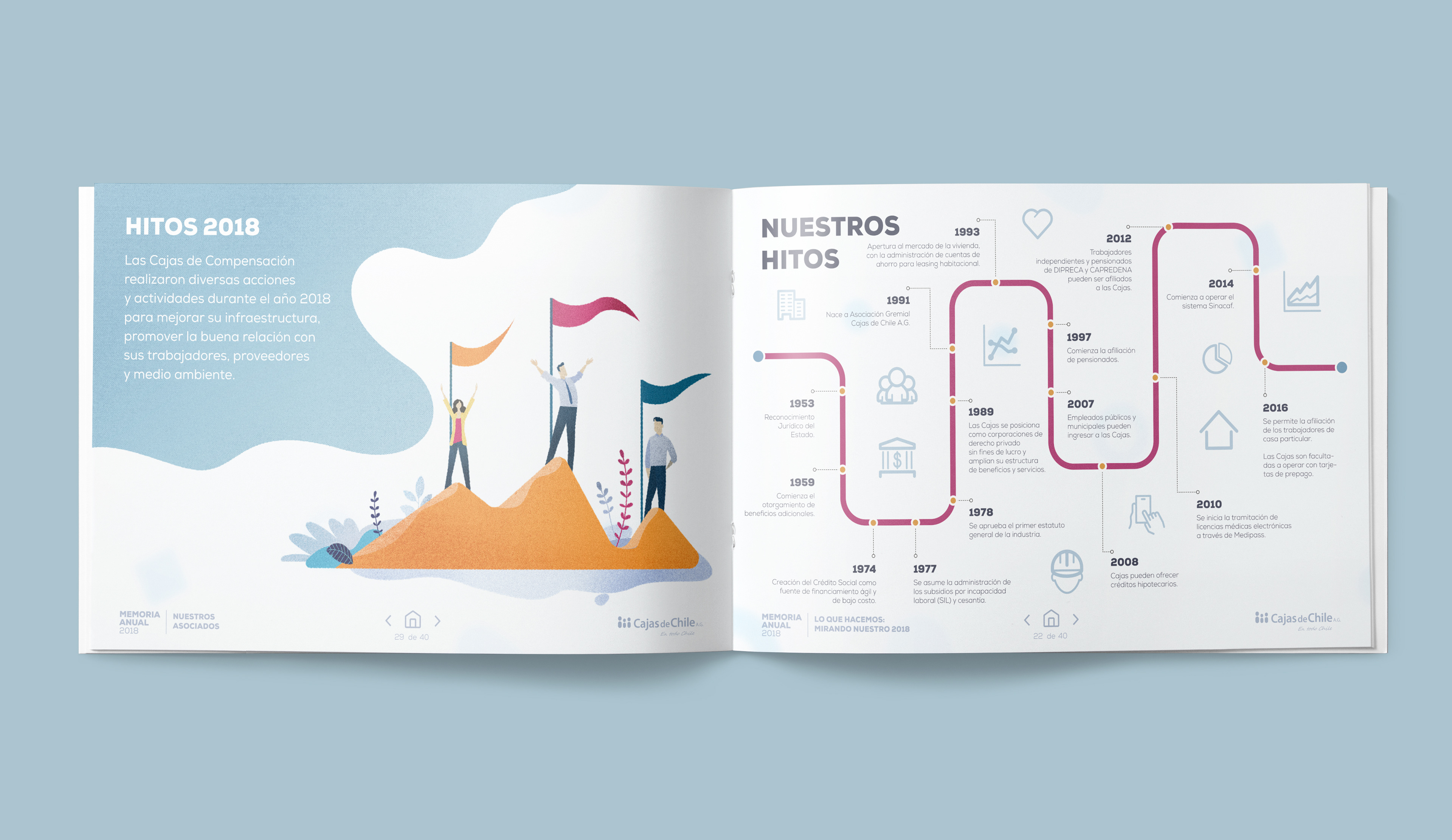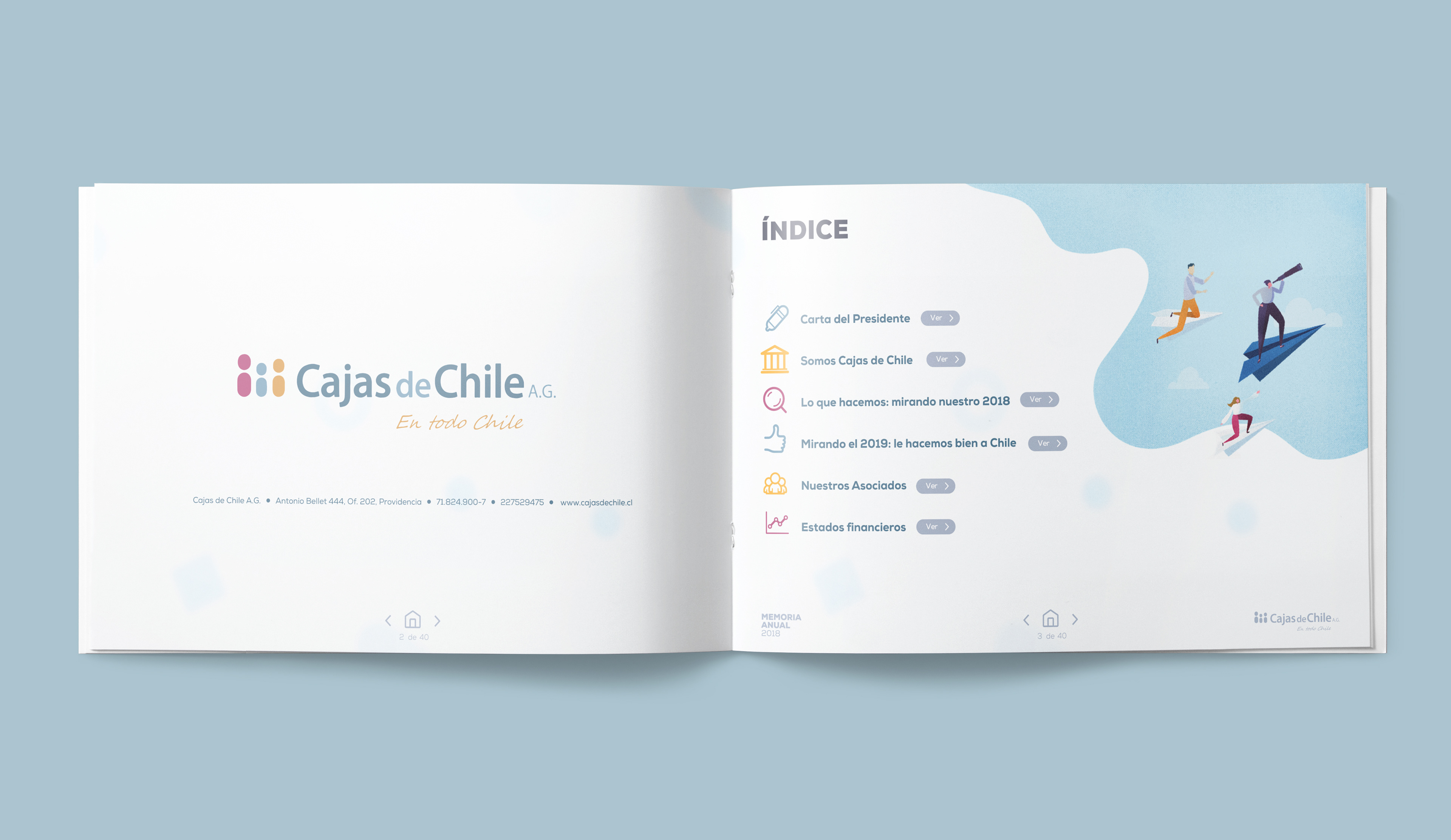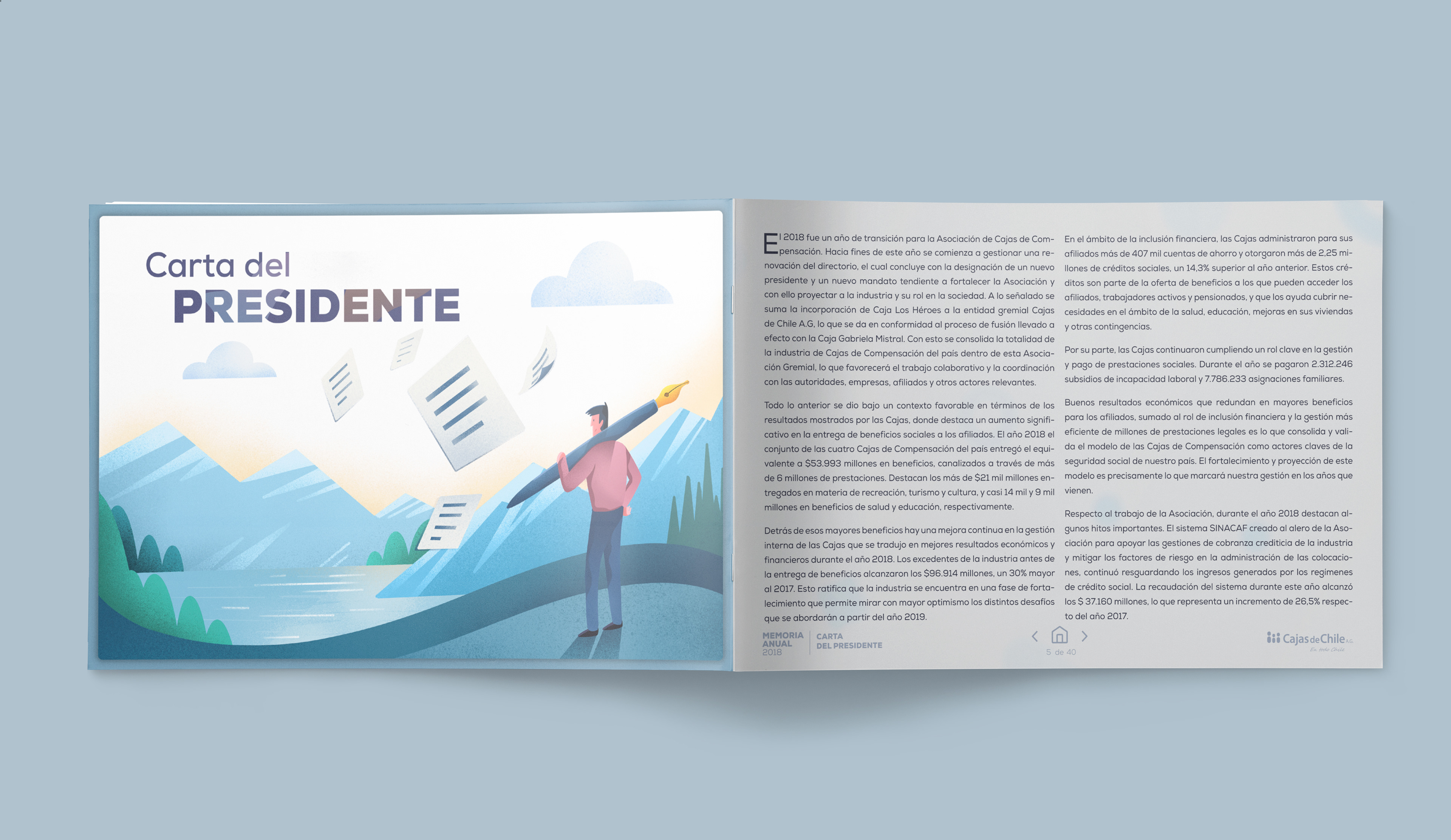 Dirección de Arte de Memoria Anual de Cajas de Chile 2018. Diseño, diagramación e ilustración.