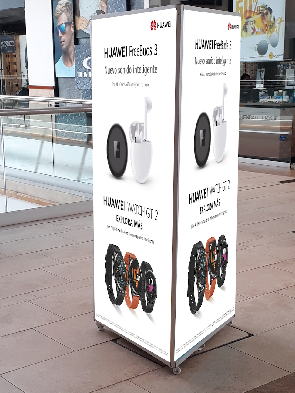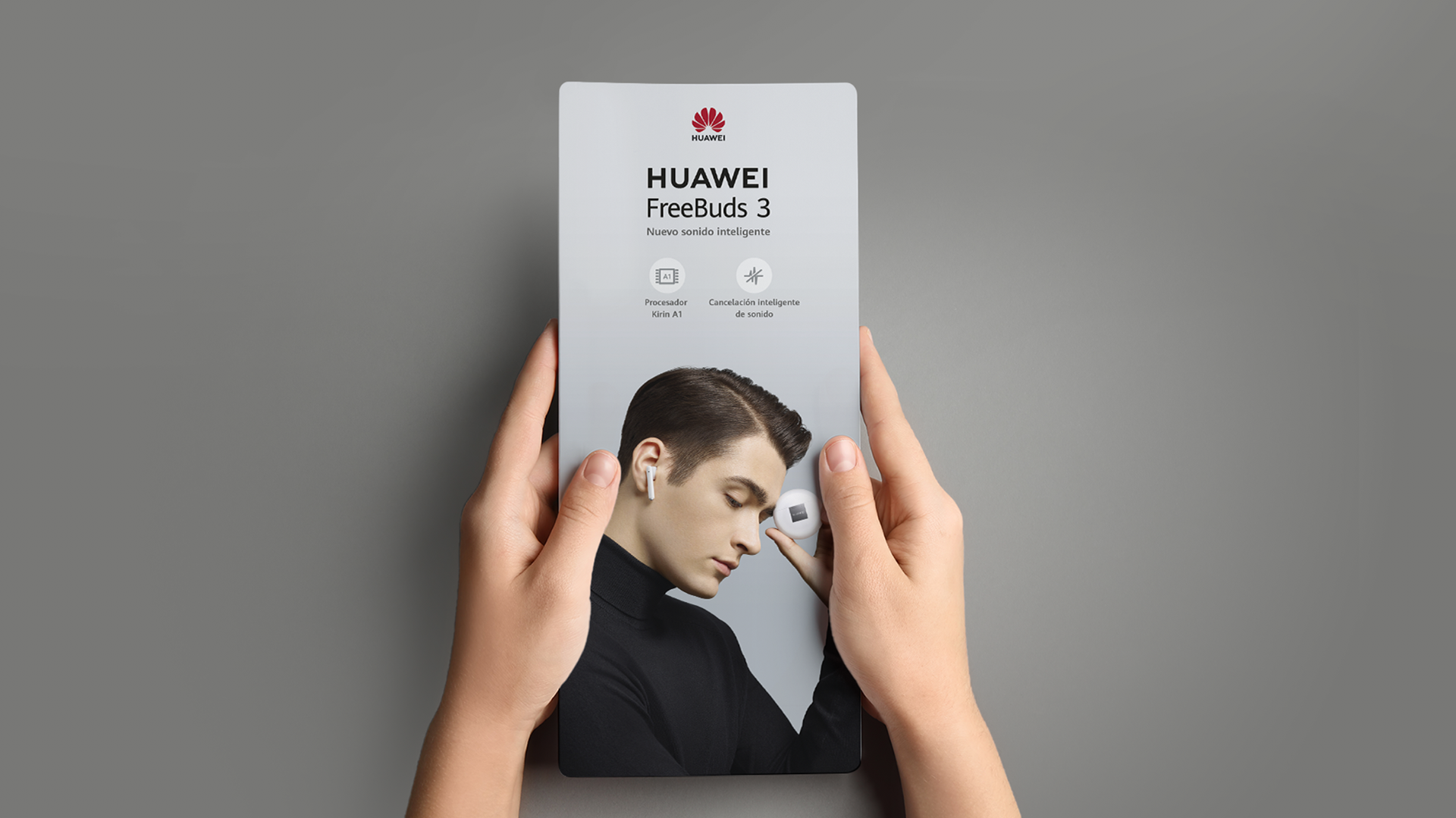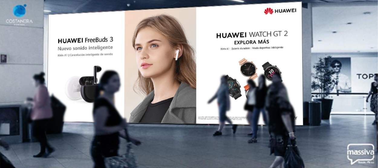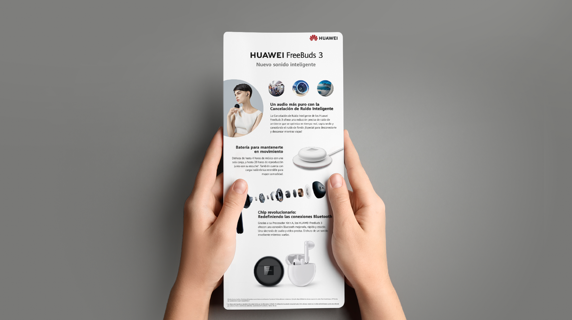 Dirección de Arte, diseño y diagramación en afiche promocional para los auriculares FreeBuds (afiche para aerolíneas). Cliente: Huawei. Agencia: Raya.