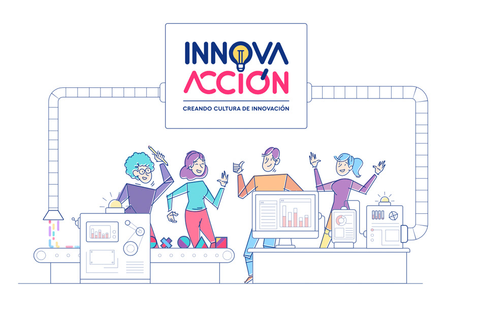 Imagen de Marca para los Tallerres de InnovAcción de Santa Rita Stage. Diseño, Ilustración de personajes, Naming, Manual de estilos y Landing.